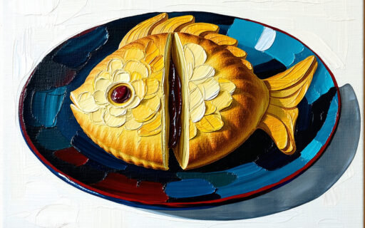 Taiyaki is a fish-shaped pastry usually filled with sweet red bean paste. The traditional single-mold style is called “natural,” while mass-produced ones are humorously called “farmed.” It has a crispy shell and soft interior.