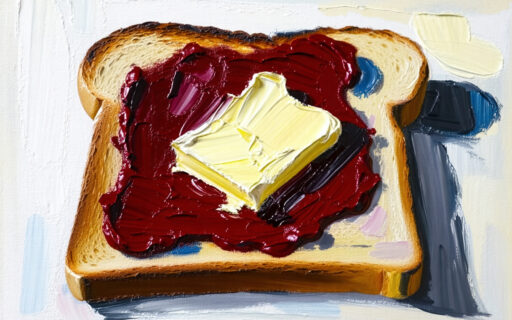 A slice of toast topped with sweet red bean paste and butter, creating a Japanese-Western fusion. The saltiness of the butter harmonizes with the sweetness of the anko, a café culture favorite.