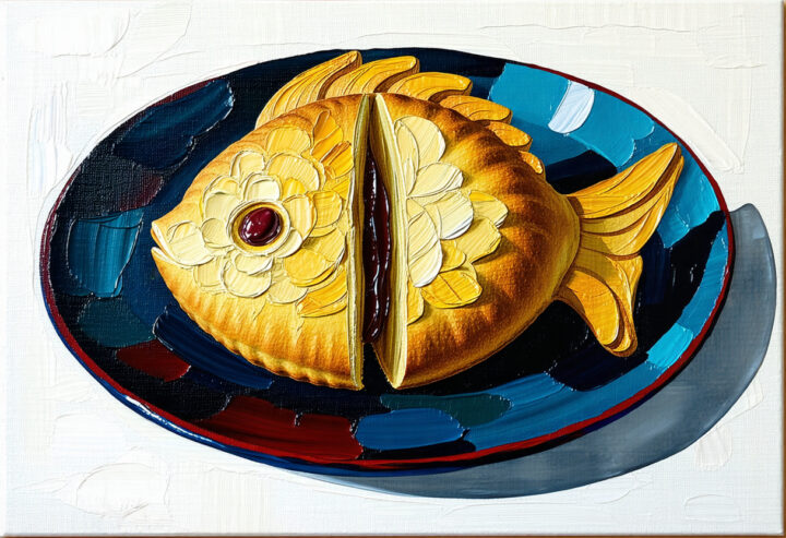 Taiyaki is a fish-shaped pastry usually filled with sweet red bean paste. The traditional single-mold style is called “natural,” while mass-produced ones are humorously called “farmed.” It has a crispy shell and soft interior.